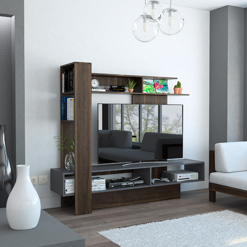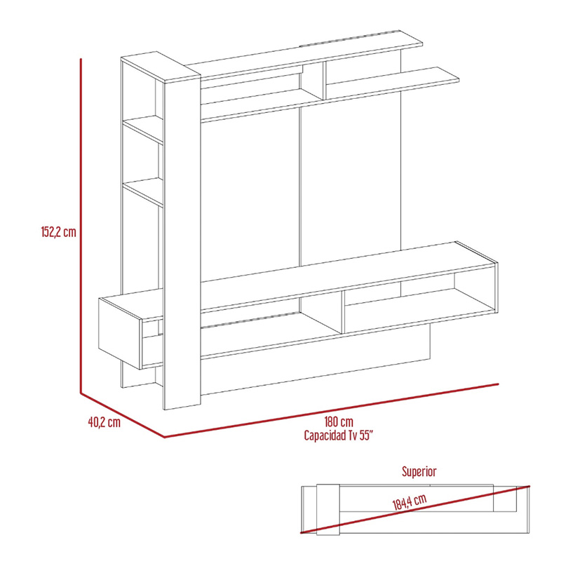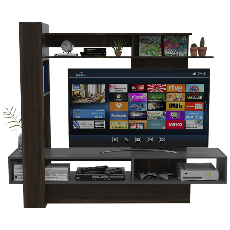 Centro de entretenimiento con espacio para tv de hasta 55″, su diseño cuenta con espacio inferior para equipo de sonido o teatro en casa. Elaborado en materiales de excelente calidad, perfecto para darle un toque de estilo a los ambientes de tu hogar. Medidas